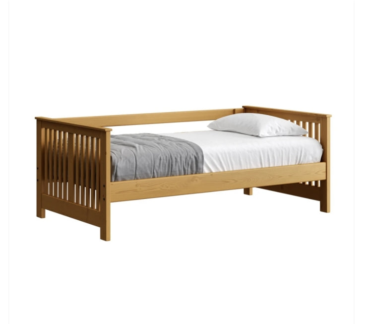 The sturdy bed ends utilize mortise and tenon construction and are all solid wood. Available only in twin size. Use with the guardrail facing out as a first bed for your child. Add optional drawers or a trundle bed for maximum use of your floor space. Ready for a mattress, no foundation required.